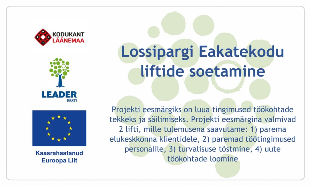 LEADER projektitoetuse eesmärk on sisustada Lossipargi Eakatekodu kaasaegse ja kvaliteetse sisseseadega, mis tõstab teenuse osutamise kvaliteeti nii klientide kui töötajate jaoks.